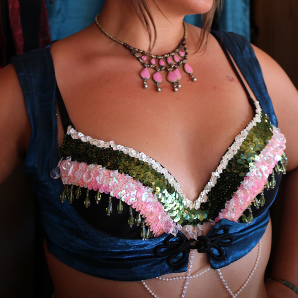 For all that glitters, our sparkle bra adds all the glitz and glamour to your world! We hand sew all our bras with a unique selection of trims, sequins, beads and sometimes coins. No two are alike!