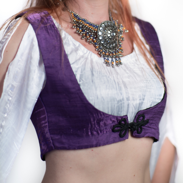 The scoop vest ties in front with decorative rings for sturdiness and comes in a wide variety of colors. You can match the Turkish Vest with your Circle Skirt or Harem Pants, which are sewn from the same lightweight crushed satin material.